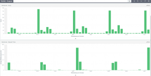 Here we have a constant low level of users arriving on our site, but also an hourly high load and random medium loading. The bar chart below shows the effect this has on our site request times.