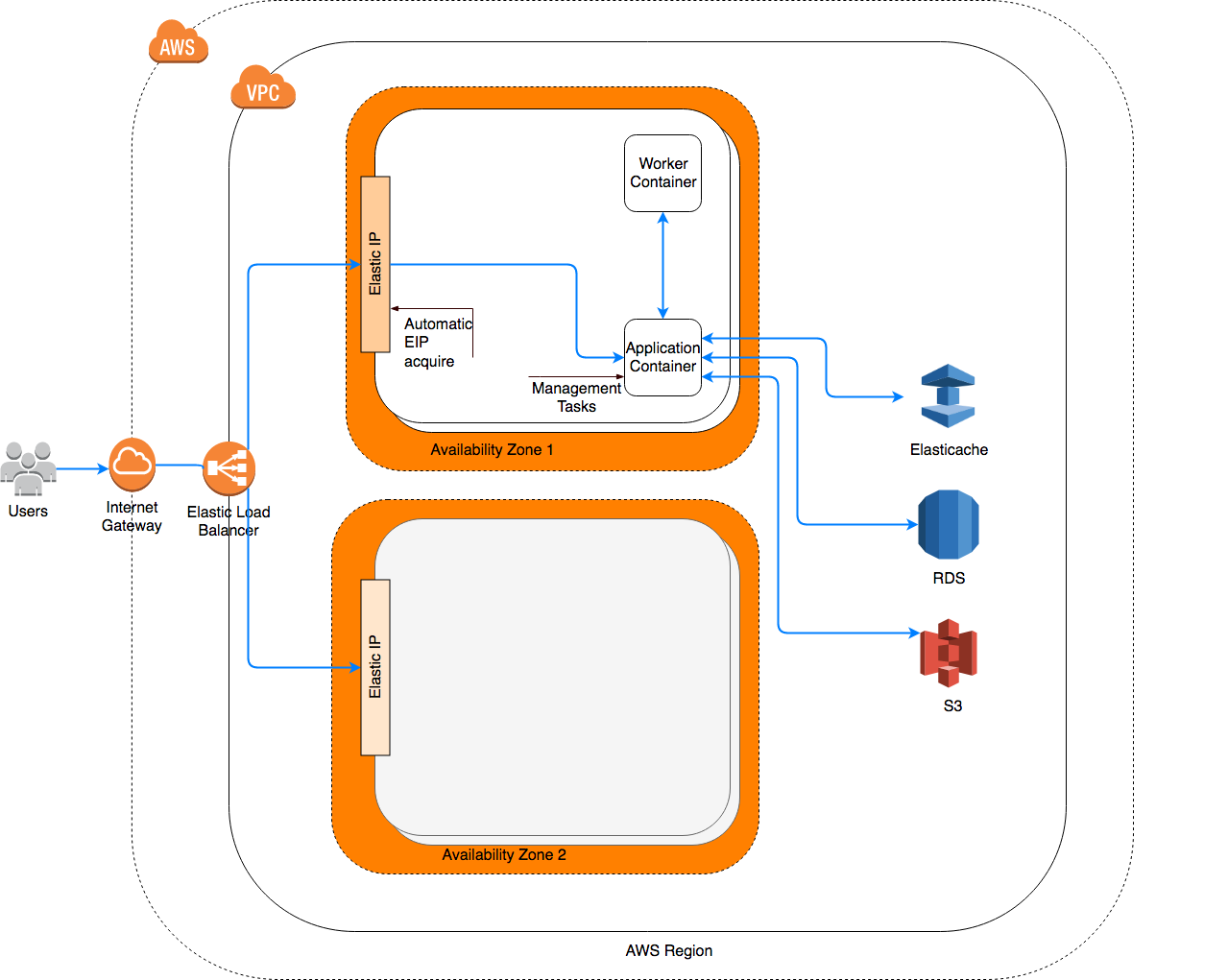 Figure 1 - A classic container service in the AWS cloud. Redundancy, self-healing, scaling groups across multiple availability zones, and a few managed components such as RDS and S3.
