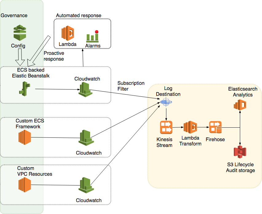 Another benefit of moving up a level is to allow us greater visibility across the entire digital estate in operation, both the virtual infrastructure and the temporal. Utilising the inherent and comprehensive metrics and logging capabilities of AWS means automating complex per-service and aggregated service response logic. But there is more we can do. The addition of data pipelines unifies this knowledge and combines it into more in-depth analysis pools. Again by making good use of off the shelf AWS advanced components we can link together cloudwatch subscriptions, destinations, and Kinesis pipes to easily create resilient and high throughput delivery streams to analysis and aggregation functions. Streaming and combining our service metric data means we can easily utilise powerful Elasticsearch Service visualisations that gives us insight on broad spectrum service behaviours and possible security attacks. The Athena analytics tool takes this live service data and means that we pull S3 log data and query and visualise it to understand the broader behaviours of services as a whole. Taken further we could apply the off-the-shelf Machine Learning capabilities of AWS to move beyond the automation of responses to live service events and into the understanding of more subtle or dispersed patterns across all our services as a whole.
