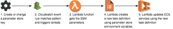 Working with credentials within ECS and passing them around is not entirely straighforward. As one way of doing this, this solution bases all environment variable storage in the AWS Parameter Store, then automatically synchronises them with the running tasks in a set of specified ECS clusters and tasks.